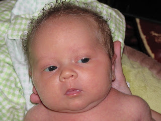 It's a good thing babies have many survival instincts. Pearl's instinct to turn her head to the side when she spits helps her not drown in her own spit up. Her instinct to cry when she wants something- food for example, helps her not to starve (though she could definately time her meals better sometimes). This week she has learned to start smiling and I have decided that can also be included under the category of survival instincts because it has helped me to not want to ship her off to China to be raised as a factory worker. The past couple of weeks Pearl has become what some call a "colicky" baby. She started crying for no apparent reason all day long. All day long. She just about drove her parents mad. We tried different medicines, soothing techniques, music; you name it, we tried it. So, when she started to smile this week both Bry and I just ate it up! She really makes us work for it though. We have to sit and coax her continuously to get her to smile. And of course she won't really smile when a camera is pointing at her. Here's a pic of a half smile: